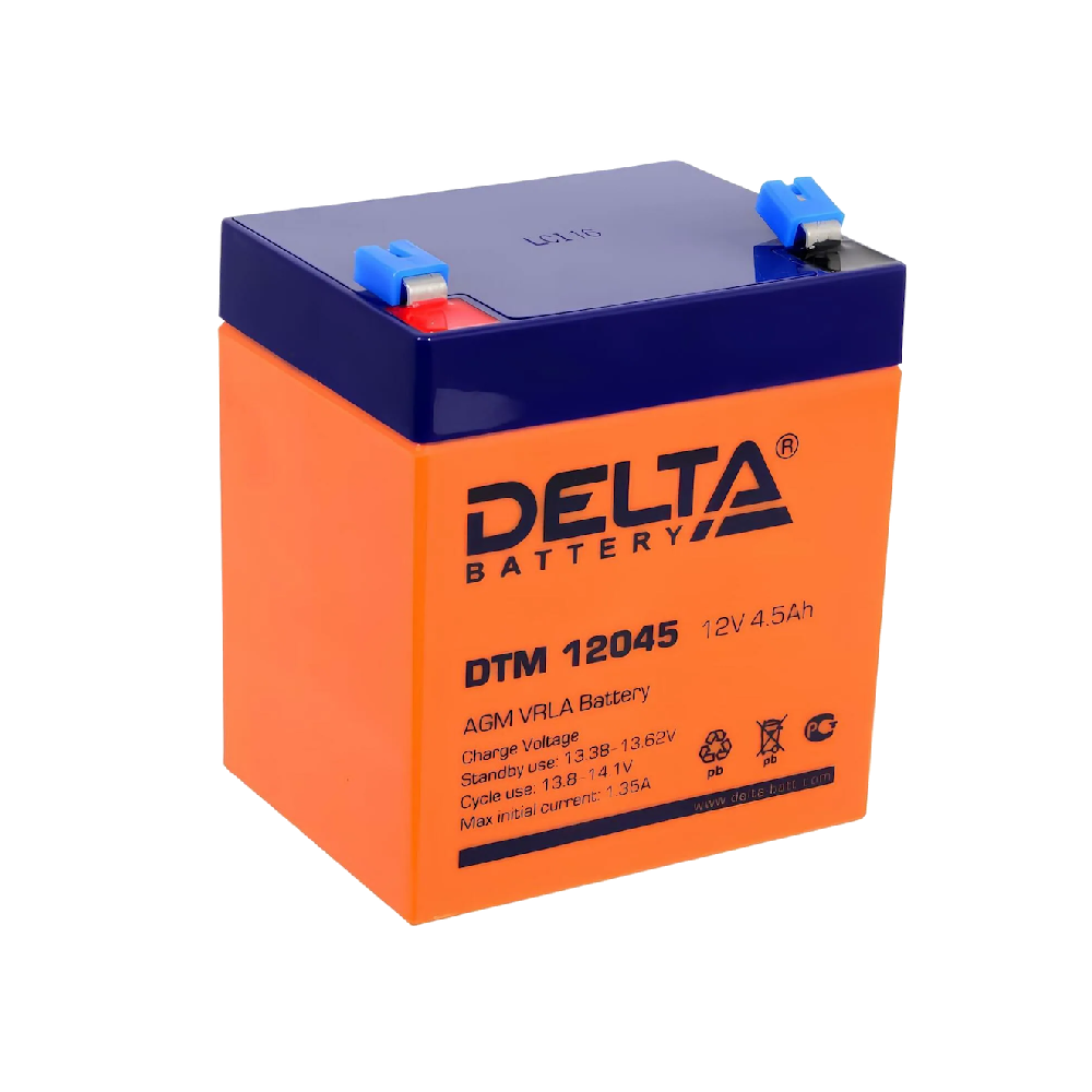 Герметизированный VRLA cвинцово-кислотный аккумулятор Delta DTM 12045 напряжением 12В и емкостью 3.2Ач изготовлен по технологии AGM (с микропористым заполнителем, пропитанным электролитом). Корпус изготовлен из негорючего ABS пластика. Срок службы аккумулятора достигает 6 лет. Аккумулятор предназначен для работы в режиме постоянного подзаряда (буферный режим) или в режиме разряд-заряд (циклический режим). Обладает низким внутренним сопротивлением и саморазрядом.