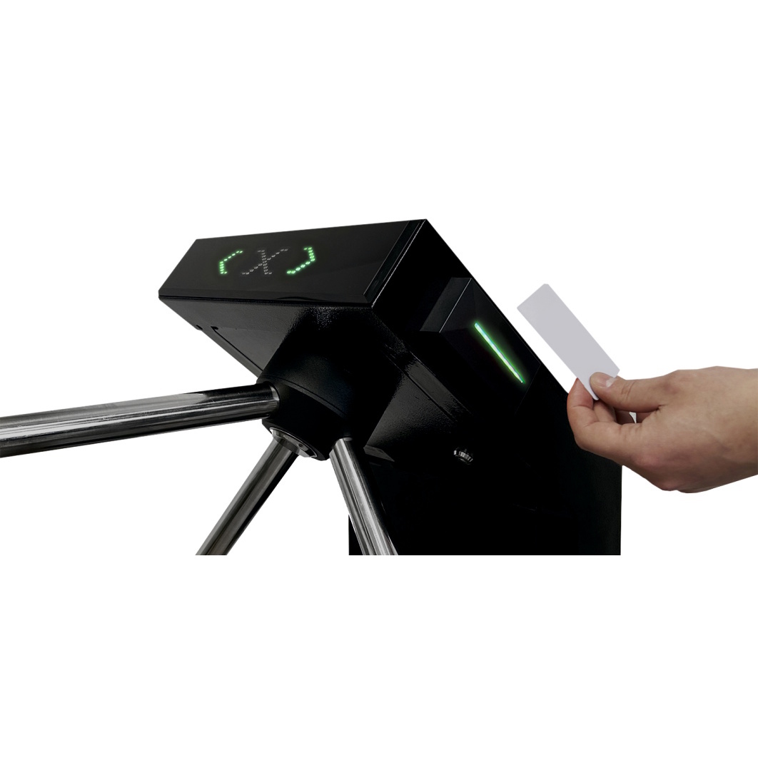 Среди особенностей турникета: черный цвет корпуса и накладка из затемненного каленого стекла. Подходит для установки на проходных в офисных и административных зданиях. Является более эстетичным вариантом турникета-трипода с предусмотренной закрываемой на ключ нишей.