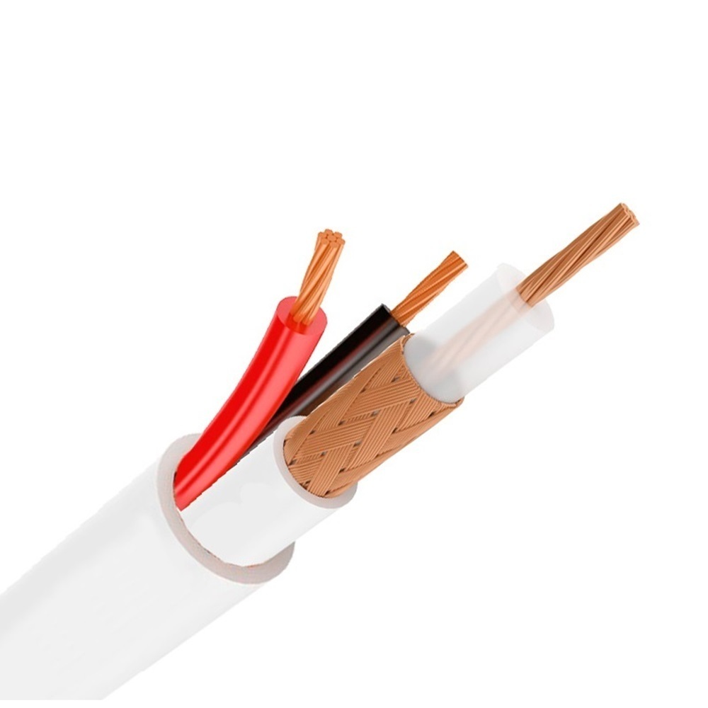 Коаксиальный кабель (центр многожильная медь, экран многожильный омедненный) +2 жилы питания сечением 0,75кв.мм (многожильные омедненные), общая оболочка из белого ПВХ пластиката (для внутренней установки).