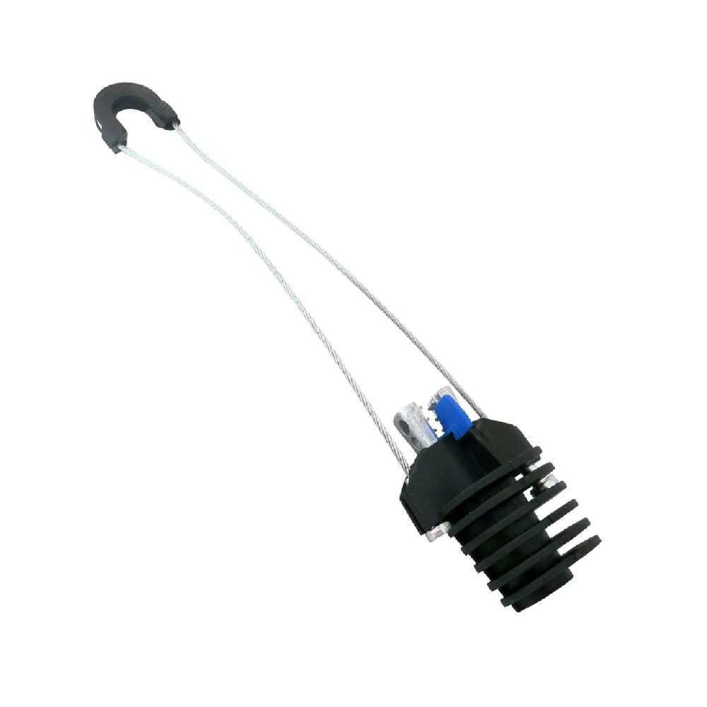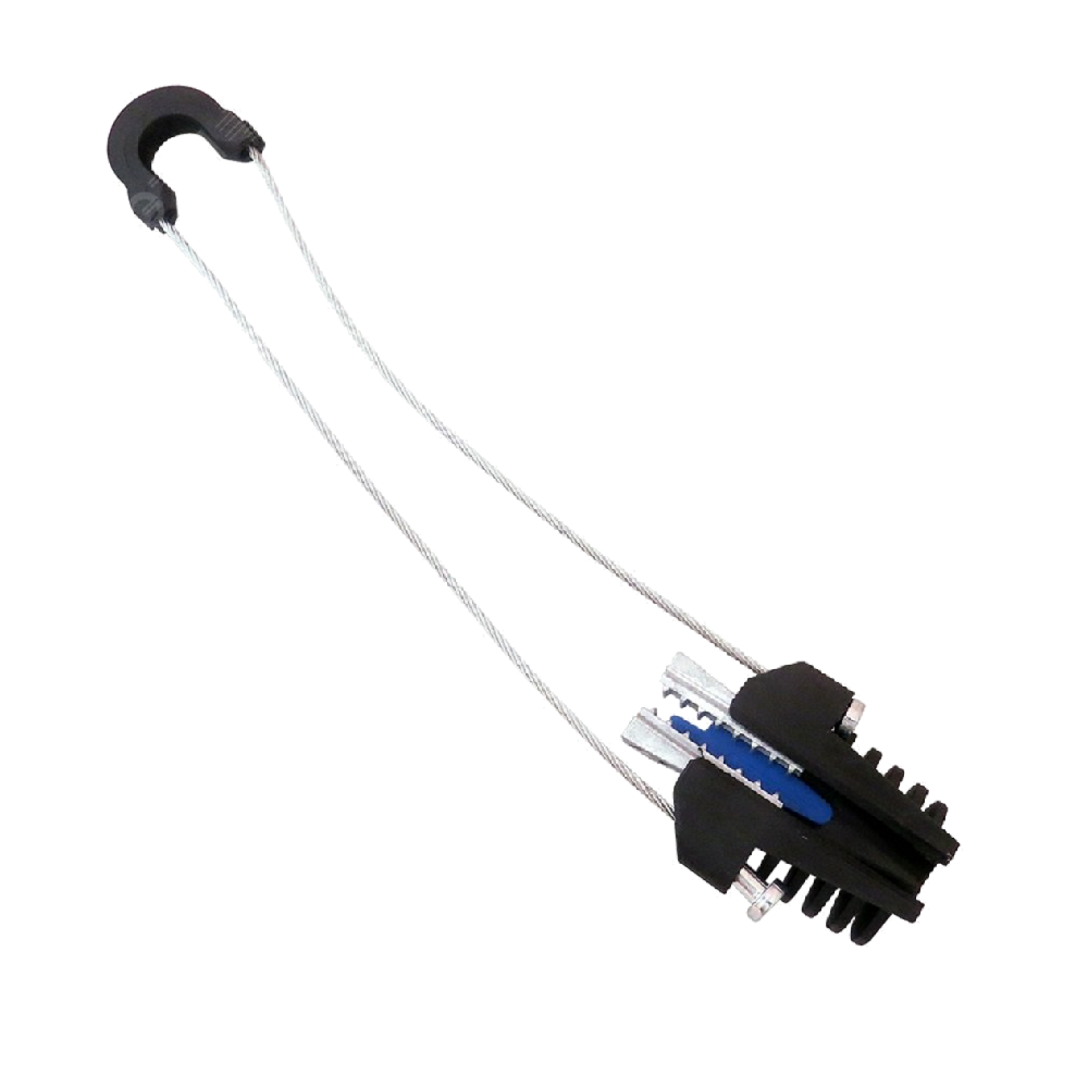 Зажим натяжной (анкерный) PA-05 с минимальной разрушающей нагрузкой 2,3 кН позволяет быстро и просто закрепить на опорах волоконно-оптический кабель типа ''8'' диаметром не более 5 мм. за несущий трос или проволоку. Анкерный зажим состоит из пластикового корпуса, пары невыпадающих металлических клиньев (зажимное устройство) и хомута из стального нержавеющего троса. Клинья имеют скругленную форму с зубьями, благодаря чему обеспечивает более ''мягкое'' сцепление зажима с несущим элементом кабеля. В этом случае кабель не повреждается в месте крепления, при действии на него рывков и чрезмерных продольных нагрузок. Продукция имеет сертификат соответствия.