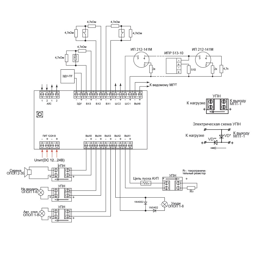 Для обеспечения контроля линии на короткое замыкание и обрыв УПН должен быть подключен непосредственно к нагрузке (к исполнительному устройству) согласно схеме подключения к Вых5 - Вых3, изображенной на рисунке. Если необходимо контролировать целостность цепи нагрузки, то подключение производится по схеме, подключенной к Вых1 на рисунке. Вместо УПН для контроля цепи можно использовать диоды - Вых2 на схеме.