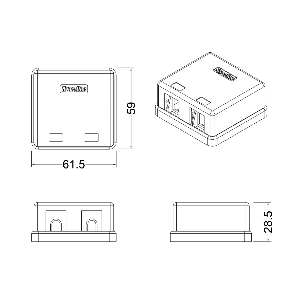 Корпус настенной розетки для установки 2-х вставок типа Keystone Jack Hyperline SBB3-2-WH от интернет-магазина "Точка Безопасности" это: