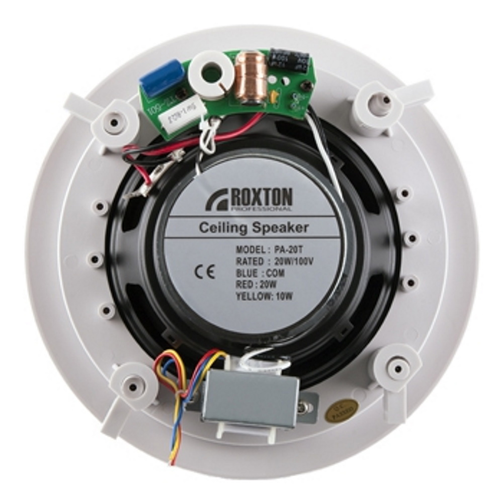 Потолочный двухполосный громкоговоритель ROXTON PA-20T сочетает в себе отличные акустические характеристики и удобство монтажа, что делает его незаменимым при построении систем речевого оповещения и музыкальной трансляции в офисных, торговых и других помещениях общественного назначения. Имея врезное исполнение, ROXTON PA-20T характеризуется способом излучения, при котором звуковая энергия направлена перпендикулярно полу, что позволяет обеспечивать равномерное звуковое покрытие при монтаже в потолок. Громкоговоритель оборудован специальными поворотными защёлками, значительно облегчающими его монтаж в горизонтальные поверхности. Встроенный трансформатор с отводами позволяет устанавливать значения мощности 10 или 20 Вт. Отличительной особенностью ROXTON PA-20T является двухполосное исполнение с применением пассивного разделительного фильтра второго порядка.