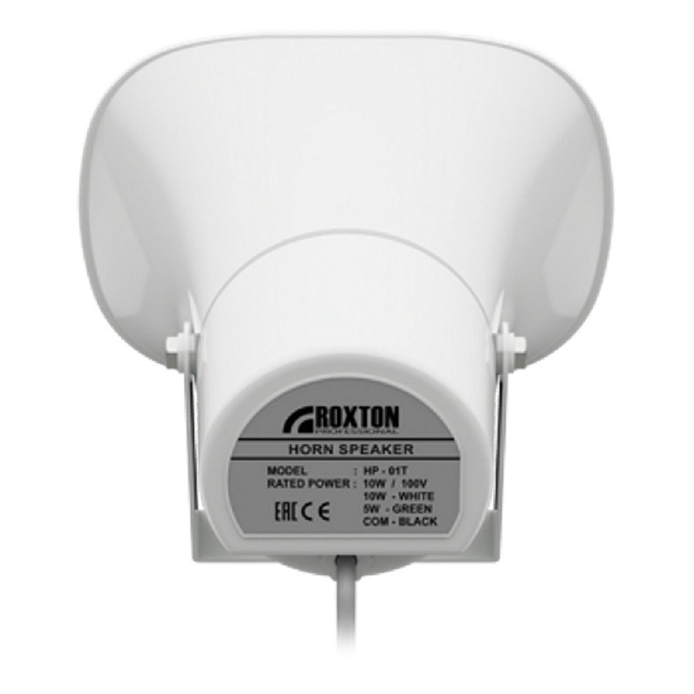 Рупорный громкоговоритель ROXTON HP-01T мощностью 10 Вт сочетает в себе хорошие акустические характеристики и удобство монтажа, что делает его незаменимым при построении систем речевого оповещения и музыкальной трансляции складов, вокзалов, парков и спортивных площадок. Выполненный из всепогодного ABC-пластика, громкоговоритель обеспечивает высокое звуковое давление вкупе с высокой направленностью звукового излучения. Громкоговоритель оборудован специальным П-образным металлический кронштейном, значительно облегчающим монтаж на различные поверхности. Встроенный трансформатор с отводами позволяет устанавливать значения мощности 5 или 10 Вт. Отличительными особенностями ROXTON HP-01 является высокая направленность излучения звуковых волн с максимальным углом раскрытия 90° на частоте 1кГц, а так же уличным исполнением с высокой степенью защиты IP66.