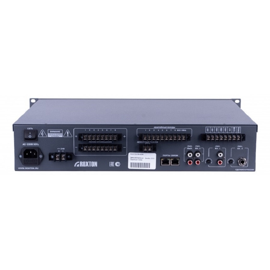 Комбинированная система ROXTON RA-8236 представляет собой цифро-аналоговый моноблок для построения законченных полнофункциональных систем оповещения, управления эвакуацией и трансляции звука. Система включает в себя блок автоматического контроля до 8-ми линий громкоговорителей, трансляционный усилитель мощностью 360 Вт с 3-мя линейными и 1-м микрофонным аудиовходами, темброблоком, поканальными регуляторами громкости регуляторами и селектором зон. Для резервирования электропитания моноблок оборудован резервным вводом с напряжением 24 В постоянного тока со встроенным зарядным устройством.
