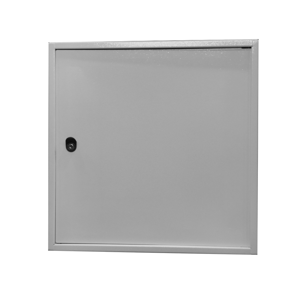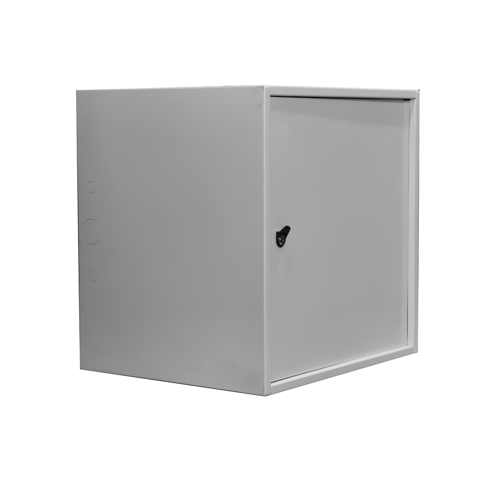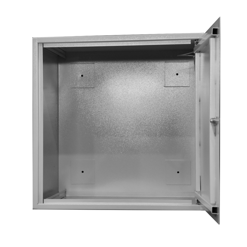 Шкаф имеет цельносварную конструкцию. Крепление к стене анкерными болтами через сквозные отверстия в задней стенке шкафа. Дверь шкафа имеет рамную конструкцию и утоплена на 10мм, фиксируется врезным ригельным замком, стойким к подбору ключей и механическим повреждениям. Специально разработанные внутренние шарниры препятствуют вскрытию шкафа путем срезания петель. Внутри установлен болт заземления.