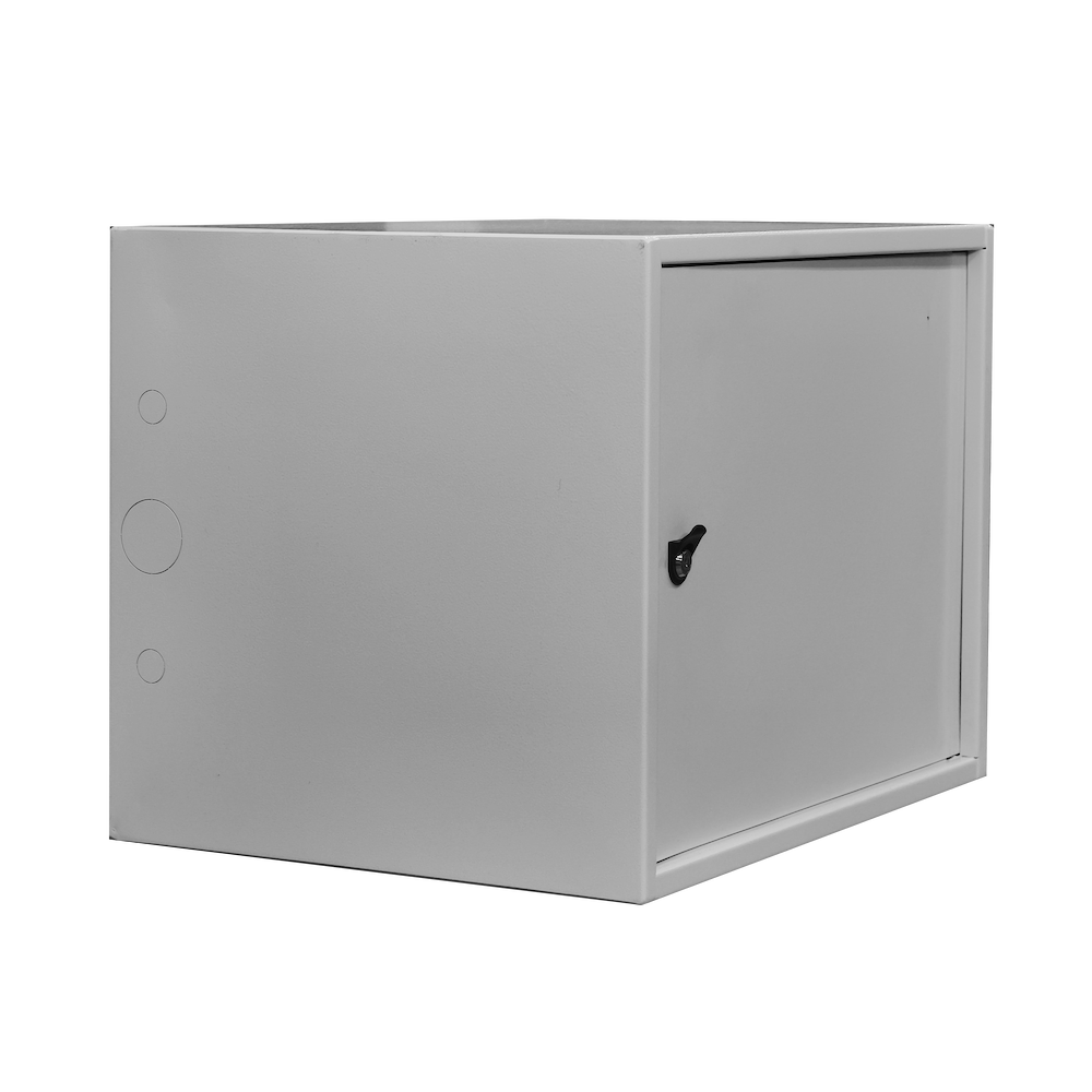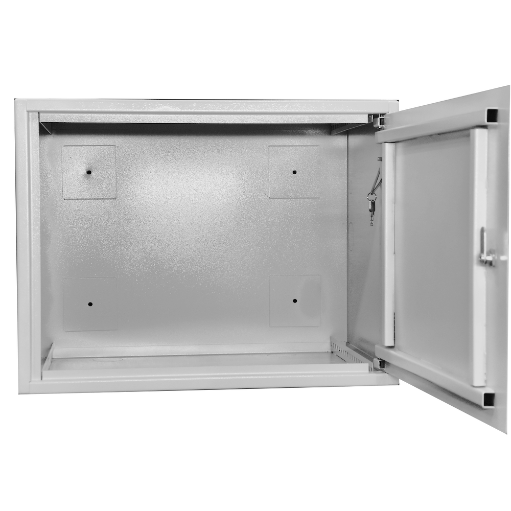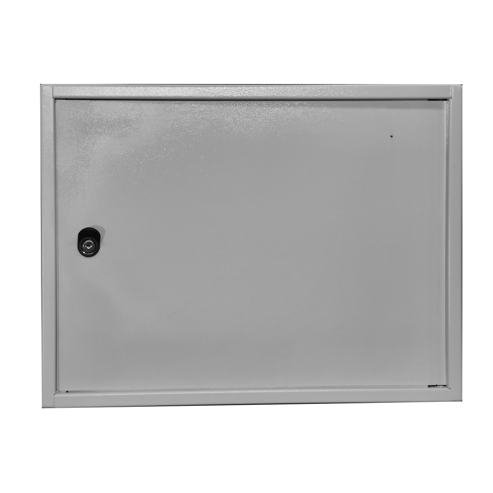 Шкаф имеет цельносварную конструкцию. Крепление к стене анкерными болтами через сквозные отверстия в задней стенке шкафа. Дверь шкафа имеет рамную конструкцию и утоплена на 10мм, фиксируется врезным ригельным замком, стойким к подбору ключей и механическим повреждениям. Специально разработанные внутренние шарниры препятствуют вскрытию шкафа путем срезания петель. Внутри установлен болт заземления.