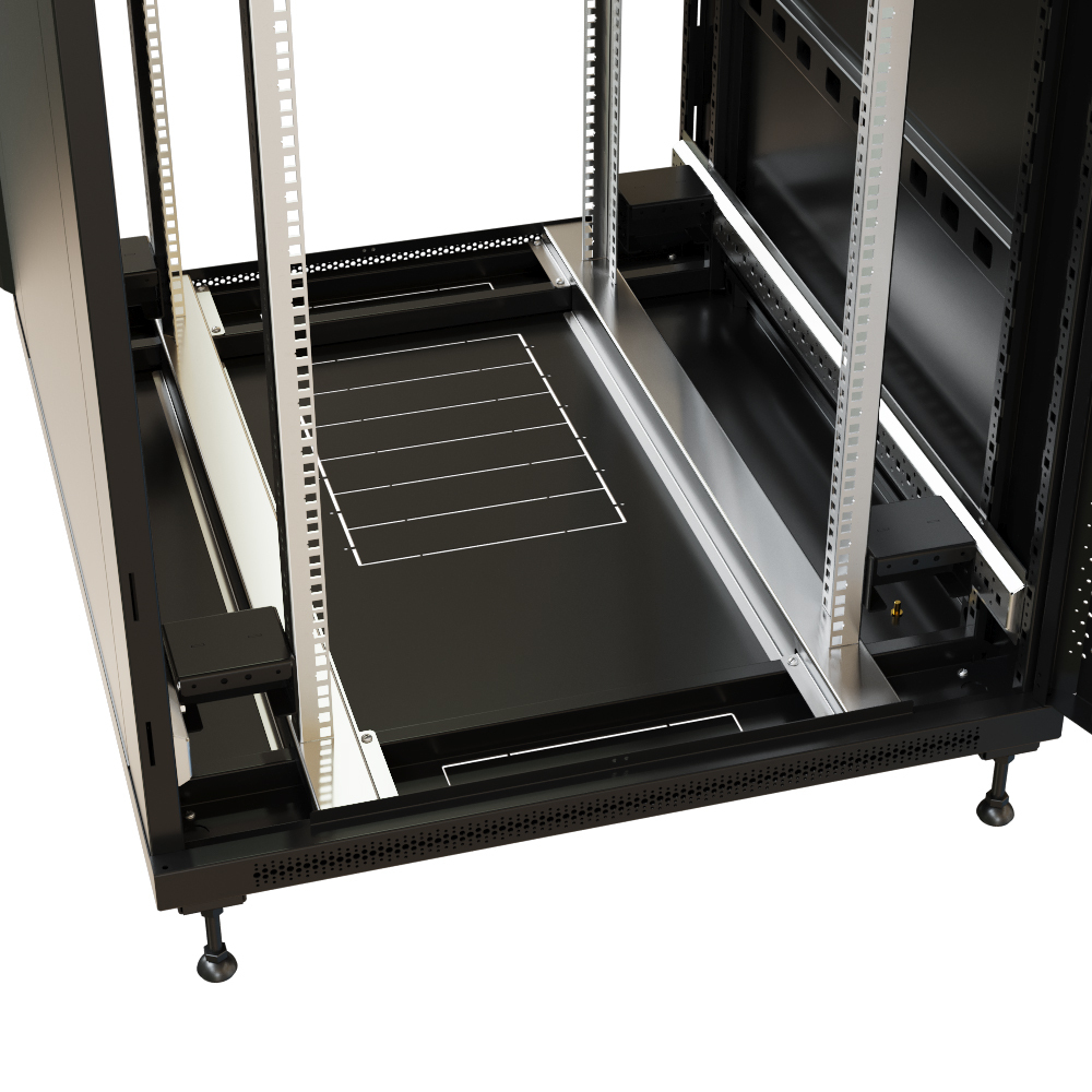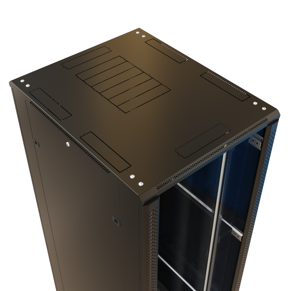 - Предперфорация в крыше и дне шкафа. Обеспечивает возможность дооснащения шкафа кабельными щеточными вводами и вентиляторными панелями, без использования специального инструмента для прорезания отверстий в металле.