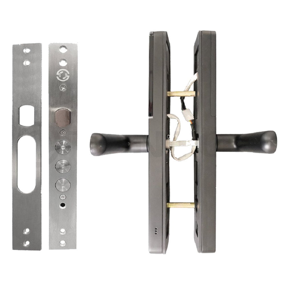 Комплект состоит из врезного механического замка и ручек-накладок со встроенной электроникой.